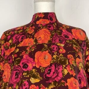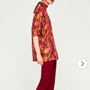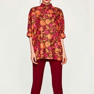 ZARA Studio 100% Silk Floral Puff Sleeve Blouse. Size small. In very good preowned condition. Luxe, rich floral printed silk top by ZARA from their Studio collection. Deep, lush, warm tones of burgundy, orange, and pink adorn this delicate blouse.