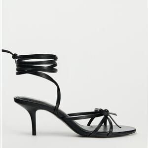 Faux leather Heeled sandals. Front bow shaped straps. Thin straps to tie around ankle. Round toe. Thin heel.