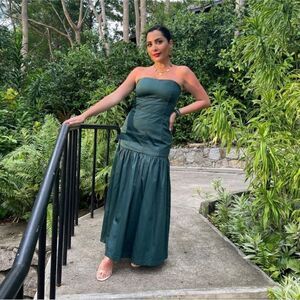 Strapless midi dress with straight neckline. Tonal matching fabrics. Side metal zip closure.