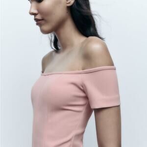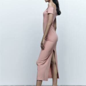 Straight neck midi dress with short off-the-shoulder sleeves. Back metal zip closure and slit at hem.