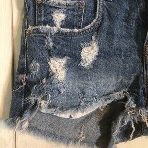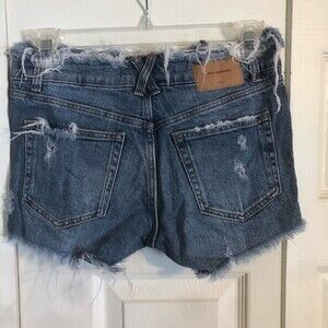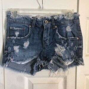 Size 00 Zara Trafaluc Denimwear cut-off distressed jean shorts. These have a frayed hem at waist and at hem. Heavy factory distressing.