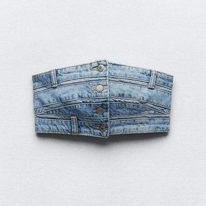 Strapless straight neck denim top. Back elastic fabric detail. Front metal button closure.