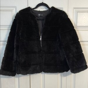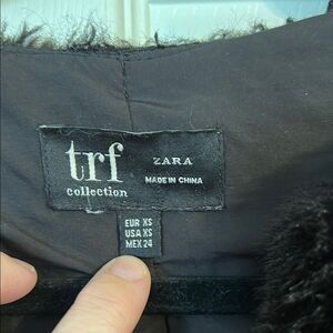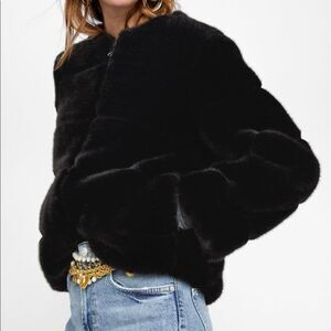 Size x-small Zara TRF Collection black faux fur jacket. This full zip front jacket is in like new condition. Fully lined with a silver zipper and vegan leather zipper cover strip. Oversized fit. Perfect for a sophisticated look or to elevate a more casual look.