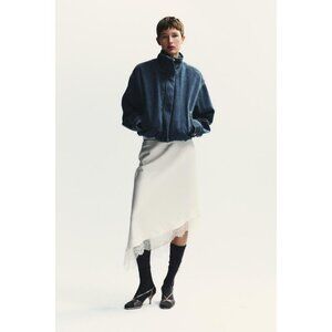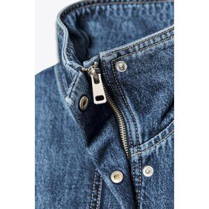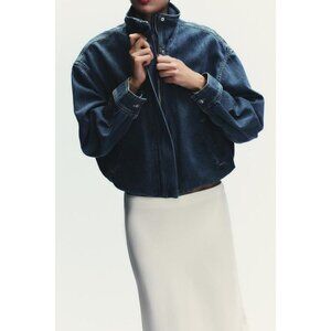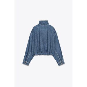 High neck, long sleeve jacket with dropped shoulders. Side pockets. Elasticated hem. Front zip fastening with a button placket.