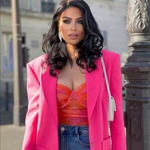 Strapless straight neck top. Draped fabric. Hidden in-seam zip closure at hem.