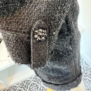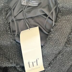 V-neck dress. Long sleeves with loops at the ends. Front pockets. Unfinished edges.