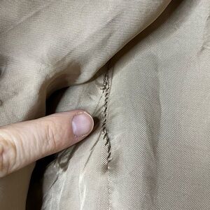 One lining hole which has been stitched as shown in last photo, please view before purchase. Gently worn, offers welcome!