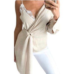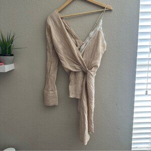 ZARA Tan Wrap Blouse Asymmetrical Tie Front Sz M Blogger Favorite Chic Top