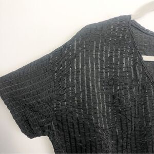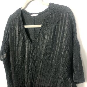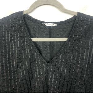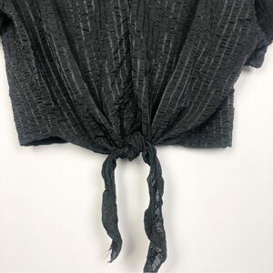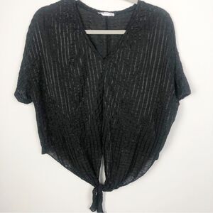 Super cute black top by Zara. V neckline. Short sleeves. Slightly sheer. Textured vertical stripes. Tie front knot detail. Great preowned xonsidion. Womens size small.