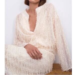 ZARA Textured Weave Fringe Sheer Midi Dress Cream Yellow Size XS