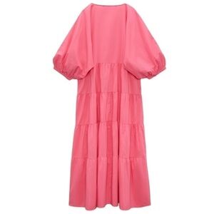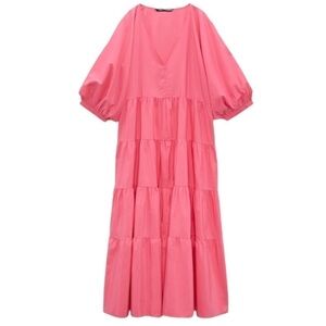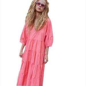 Midi dress with V-neck and below-the-elbow length sleeves. Tiered skirt.