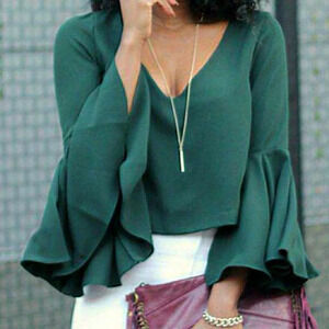 Dark green top with dramatic bell sleeves from Zara. Slightly cropped style with v neck in the front and back. Back keyhole detail