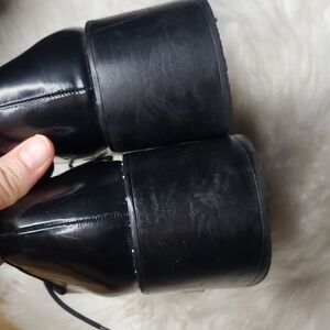 It has normal signs of wear like minor creasing and some scuffs on the patent vegan leather