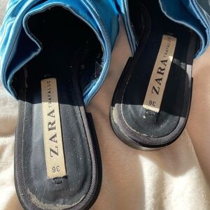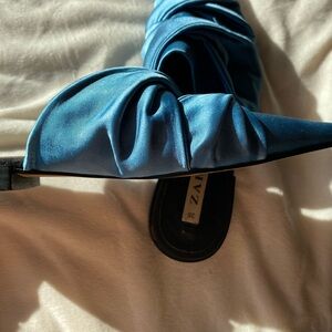 ZARA Trafaluc Teal Blue Satin Pointed Toe Mules – Ruched Slip-On Heels
