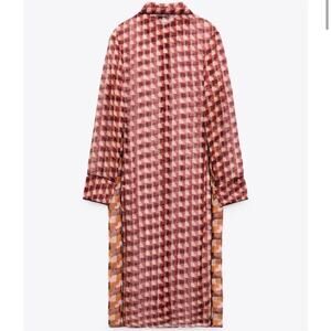 Semi-sheer tunic with lapel collar and long sleeves with cuffs. Front button closure. Contrasting side stripe detail.