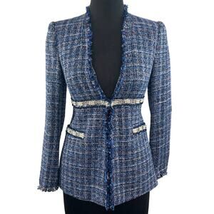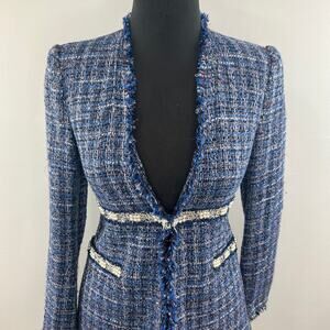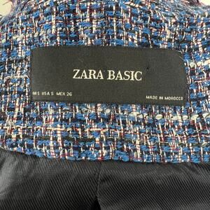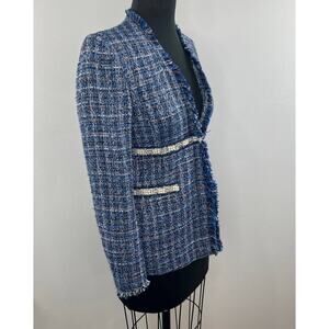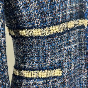 Zara Tweed Blue Blazer Jacket Pearl Beaded Long Sleeve Hook Closure Lined