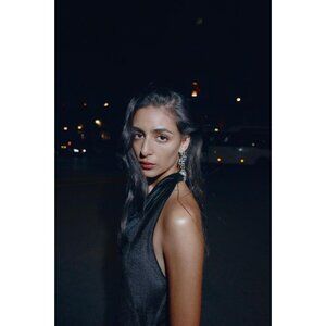 Halter neck flowing dress with an open back. Asymmetric hem with tonal lace. Back fastening with hidden buttons.