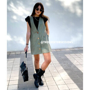 ๐ ZARA V-Neck Button Mini Dress NWT | Green Faux Leather Pinafore S/M