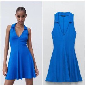 ZARA V-Neck Collar Sleeveless Blue Ribbed Fit & Flare Swing Mini Dress Sz M
