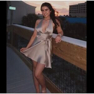 Elegant taupe gray short dress featuring a deep V-neckline, open back with self-tie, and soft satin-like drape. Hidden side zip closure and tonal interior lining create a smooth, elevated silhouette perfect for date nights, parties, and special events. New with tags and sold out in stores.