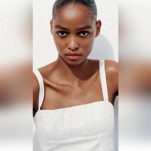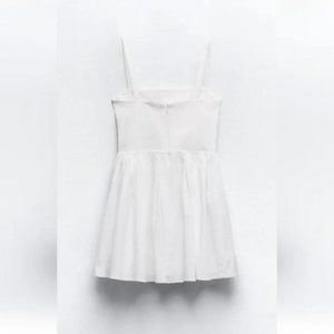 Short dress with straight neckline and straps. Pleat detail at chest and waist. Tonal interior lining. Back hidden in-seam zip closure.