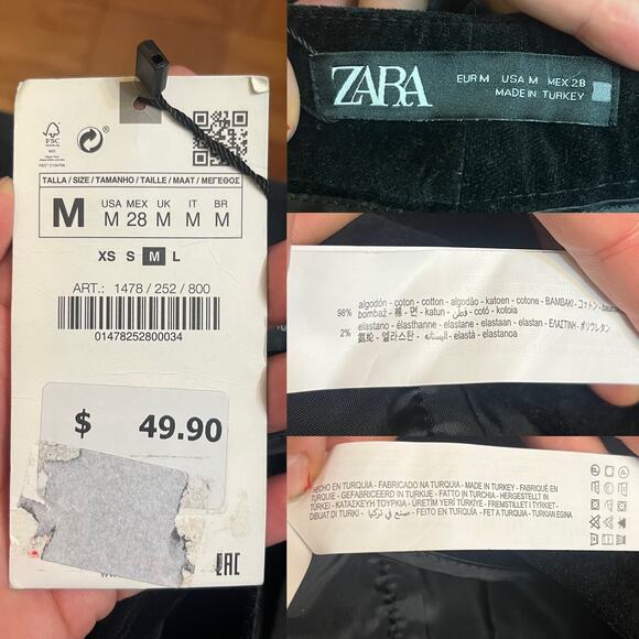 ZARA Velvet Pants Flare Leg Black High Rise Pockets Cotton Black Medium NWT