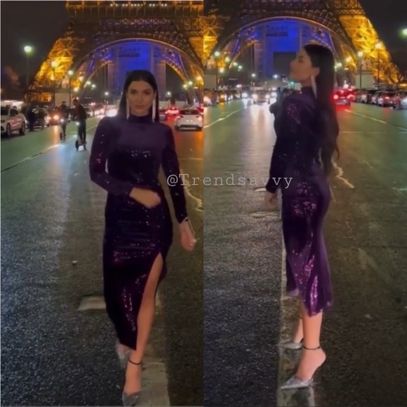 Beautiful and sexy sparkly velvet dress with high collar, back keyhole, front side slit and long sleeves. Adorned with iridescent metallic sequins. Really stunning in person! Perfect for a party or special occasion!