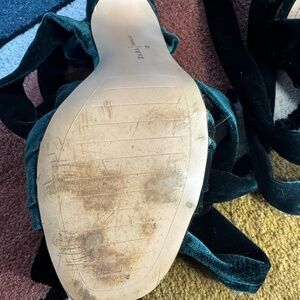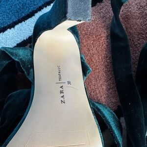 Elevate your look with these stunning dark green velvet heels from Zara. Featuring a romantic bow detail and long wrap-around ankle ties, these shoes are both elegant and statement-making. The block heel offers comfort and stability, while the plush velvet adds a touch of luxury. Perfect for parties, dinners, or special occasions.