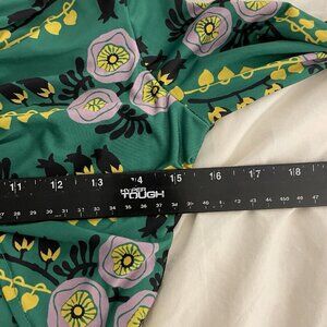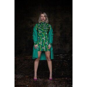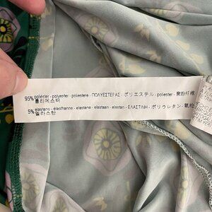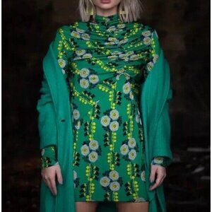 ZARA W/B Drape Ruched Mock Neck Midi Dress Sz S Green Floral 70s Retro Portugal Disco Rave Fairy Botanical