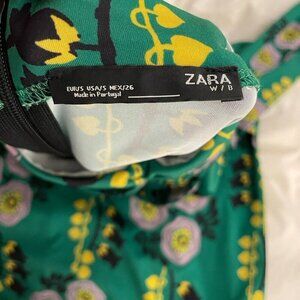 ZARA W/B Drape Ruched Mock Neck Midi Dress Sz S Green Floral 70s Retro Portugal
