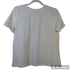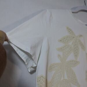 Style: White round neck, short sleeve tee with lace applique details in the front.