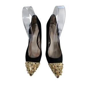 Wowwww! From Zara Woman are these really cool black suede leather pumps, heels with a gold toe, embellished in black and white rhinestones and pointy gold studs! Awesome look! Heel- 3.5", Size 9.5M, (EU 40) Excellent! Superb EUC Condition! **ABSOLUTELY GUARANTEED CONDITION: EUC MINTY-EXCELLENT TO LIKE-NEW, by Lily @HauteClub!*** *Measurements always available on request!*