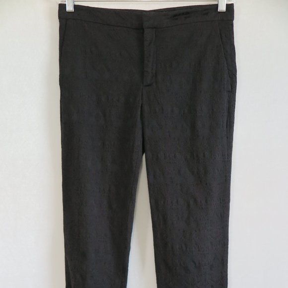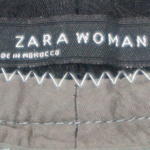 ZARA WOMAN Black Textured Viscose Blend Tapered Zip-Ankle Pants Size M. Waist is 32", hips are 38" and inseam is 29". 5" ankle zippers. 57% viscose, 38% cotton and 5% elastane. Front zipper with hook and button closure. Two front vertical and two rear horizontal pockets. Textured jacquard pattern. Versatile style that can be "dressed up or down". Excellent condition.