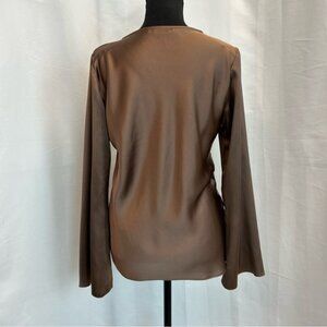 ZARA WOMAN CHOCOLATE BROWN SATIN BLOUSE SHIRT PEEP HOLE TIE BOW FLARE SLEEVE L