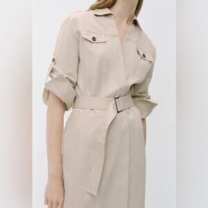 ZARA WOMAN COLLECTION Midi dress made of cotton blend fabric. Lapel collar and long sleeves with adjustable strap cuffs with buttons. Front flap pockets with buttons. Adjustable self belt with buckle. Front hidden button closure.