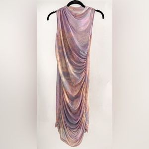 Sleeveless high collar mini dress. Contrasting inner lining. Ruching detail.
