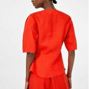 ZARA WOMAN Red Linen Puff Shoulder Wrap Top