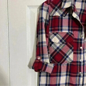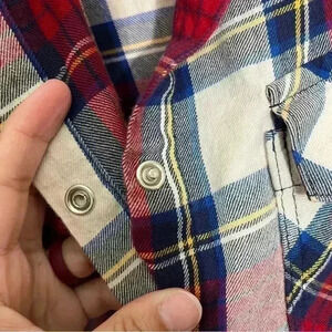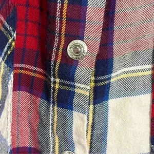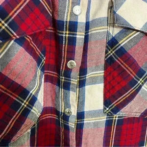 In good preloved condition. Colors are red, blue, and cream with a bit of yellow. Functional pockets on both sides of chest area. No stains or rips. Tab sleeves. 100% cotton. Smoke and let free home.