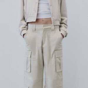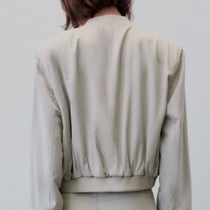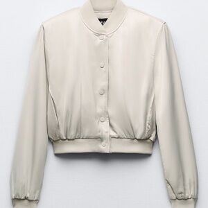ZARA SATIN EFFECT CROP BOMBER SIZE XL SAND NEW WITH TAGS. Round collar bomber jacket with long sleeves with shoulder pads. Tonal rib trim. Side pockets. Front snap button closure.
