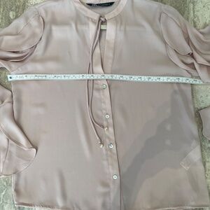 BEAUTIFUL ZARA TOP FLOWY ROMANTIC NEUTRAL BLUSH LIGHT PINK COLOR SIZE XS APPX MEASSUREMENTS 19 1/2" CHEST 22 1/2" LONG 15" SHOULDER WORE TWICE. ALL MY ITEMS COME FROM A SMOKE AND PET FREE HOME