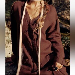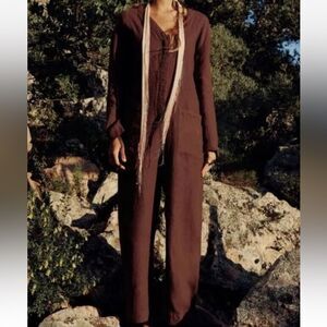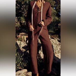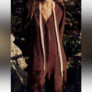 ZARA WOMAN V-NECK LONG SLEEVES PATCH POCKETS LINEN JUMPSUIT : BROWN