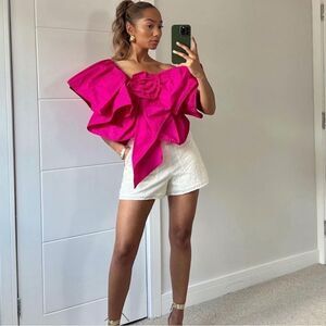 ZARA WOMEN ASYMMETRIC RUFFLED TOP FUCHSIA FLOWER VOLUMINOUS, SIZE S