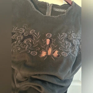 Beautiful Embroidered florals across front bodice and skirt, and around sleeves. Scalloped neckline, sleeves, and hemline. The go to little black dress for almost any event.
