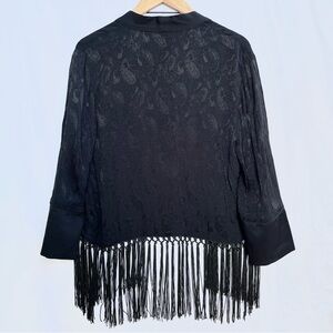 • Medium. Black. Fringe tassel hangs along the hemline effortlessly. Paisley print embossed all throughout the entire kimono. Lightweight.