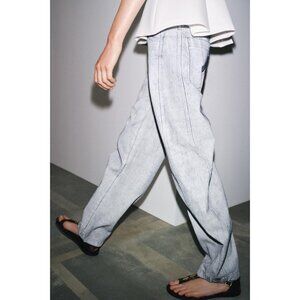 The Tapered Coated Mid-Rise Jeans from ZARA Woman Collection are constructed in 100% Cotton dark blue denim twill fabric with silvery white coating. They feature a mid rise low on the hip fit, brushed silver/brass zipper fly closure, belt loops, 2 front pockets, 2 back patch pockets and a baggy barrel tapered leg silhouette. These are editiorial, k-pop, boho, avant garde, day to night, slouchy, relaxed, coastal cowgirl, southwestern, baggy minimalist vibes.