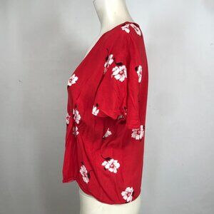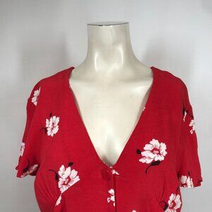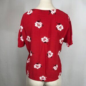 ZARA- WOMEN'S LARGE - RED FLORAL SHORT SLEEVE V NECK BUTTON UP TOP