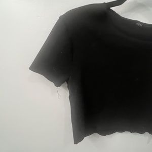 *Product Details: Zara Women’s Black Short sleeve top. Cropped Length. Ribbed Knit fabric. Round Crew neckline. Pull On style. Fitted Stretch Fabric. Machine wash cold.