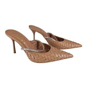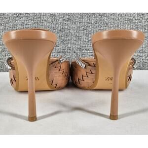 Chic and statement-making ZARA mules in woven tan textile with rhinestone-encrusted strap. Features a pointed toe, open back, and sleek stiletto heel for elevated styling. Perfect for evening wear, resort looks, or fashion-forward street style.