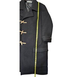 This is a Zara wool blend coat in black, size M, featuring toggle closures. It is a long coat with a wool lining, part of a limited edition collection for autumn and winter.