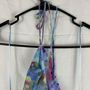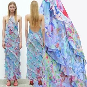 ZARA Watercolor Floral Halter Backless Maxi Dress Size XL Ruffle Details